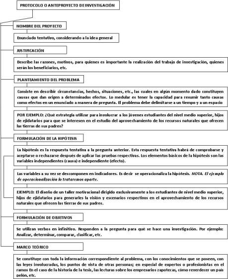 Con la recopilación se inició la elaboración del protocolo o anteproyecto de tesis; sus elementos, indicados por la institución son los siguientes: