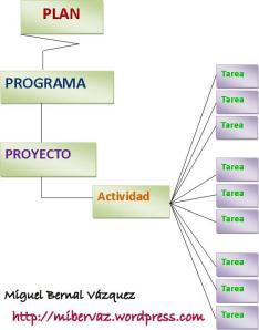 Asimismo, en el siguiente mapa cognitivo se muestra la relación de un proyecto con respecto a un plan, programa, actividad y tarea. Cabe aclarar que la estructura del mapa conceptual es autoría de un servidor y el contenido de Ander-Egg y María José Aguilar.