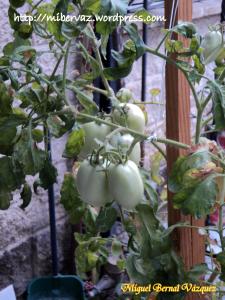 Sembré las semillas, las cuales en pocos días germinaron, y de acuerdo a las instrucciones recibidas, cuando las plantitas tuvieron tres o cuatro hojitas las trasplanté a un pequeño espacio de un metro de largo por sesenta centímetros de ancho. Se lograron dos plantas, las cuales florearon a los dos meses de trasplantadas y que sujeté a un soporte de madera denominado tutor (se muestra en la fotografía). Coseché dieciocho jitomates.